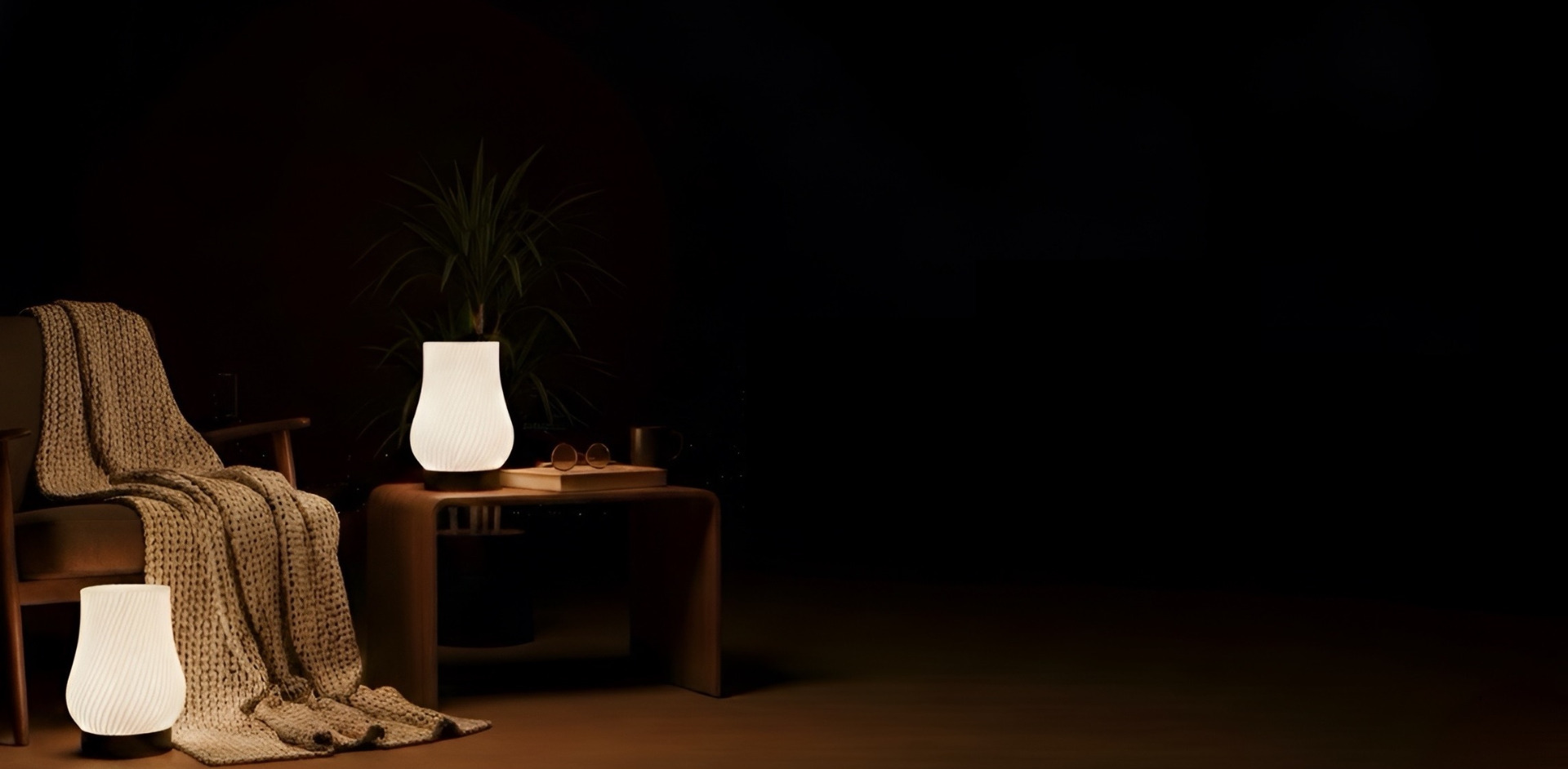 Jemná textura difuzoru a kontrast černé základny vytváří nadčasový doplněk do každého interiéru.