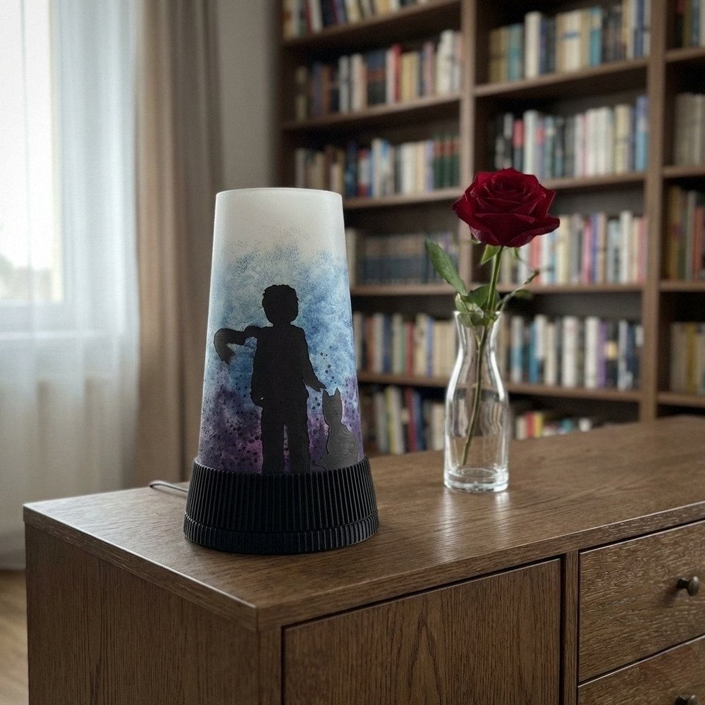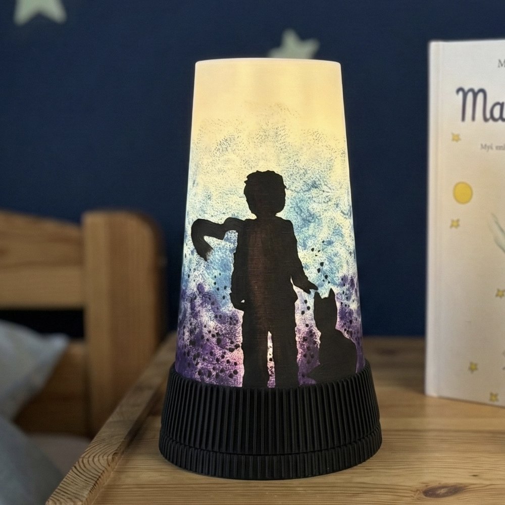 Ručně malovaná dekorativní lampa inspirovaná poetikou Malého prince přináší do interiéru kouzlo dětského pohledu na svět. Silueta prince a lišky připomíná přátelství, sny a radost z objevování. Teplé světlo jemně prosvítá difuzorem a vytváří klidnou atmosféru, která potěší děti i dospělé.