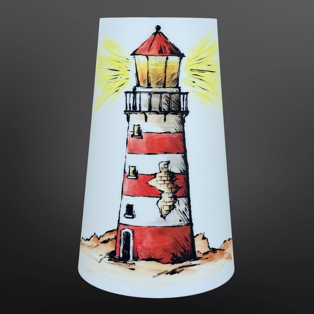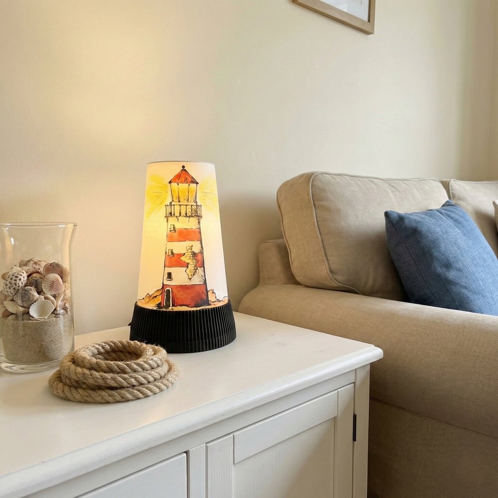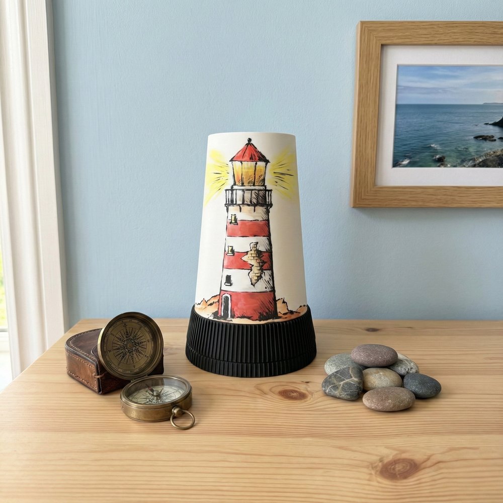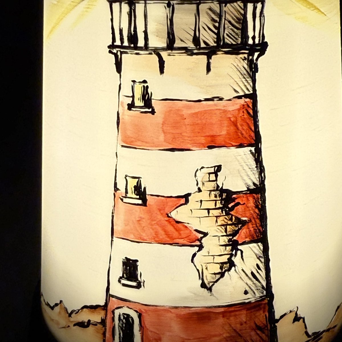 Ručně malovaná dekorativní lampa s motivem majáku symbolizuje světlo, klid a bezpečný návrat. Jemné teplé světlo příjemně rozptyluje difuzor a vytváří uklidňující atmosféru – ideální pro večerní zklidnění, čtení nebo jako výrazný doplněk moderního interiéru.