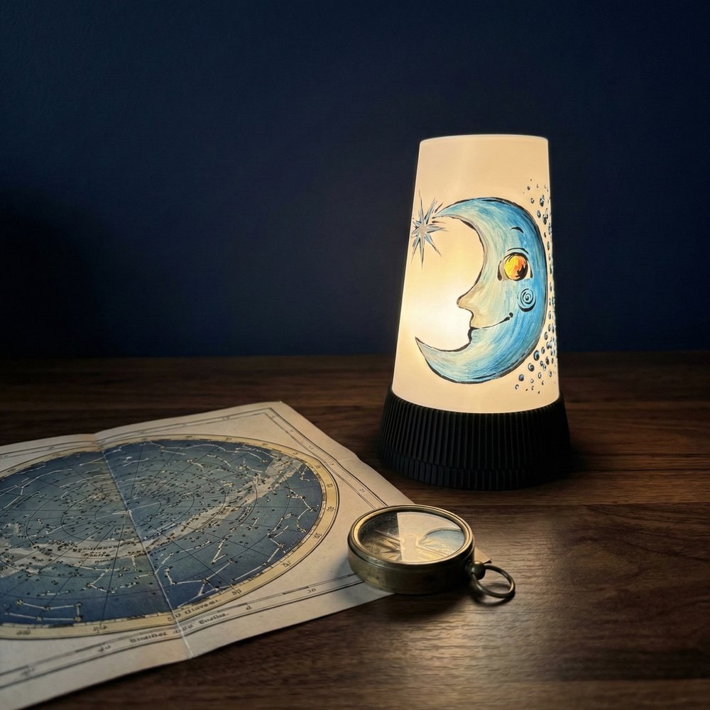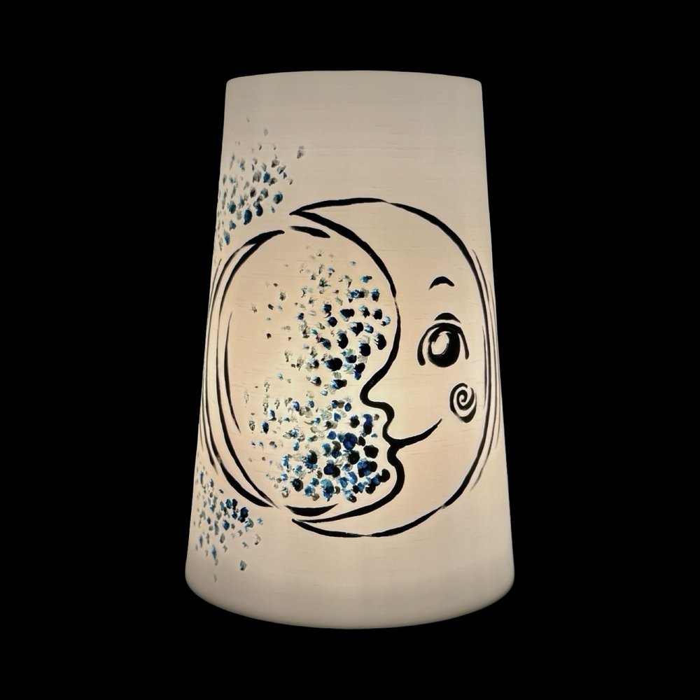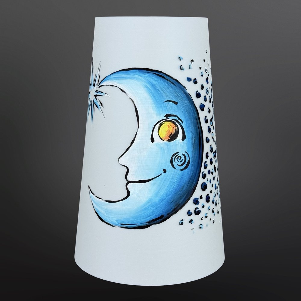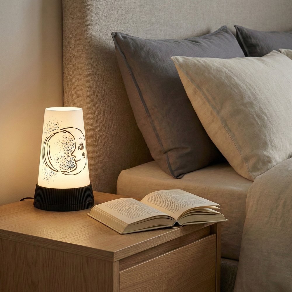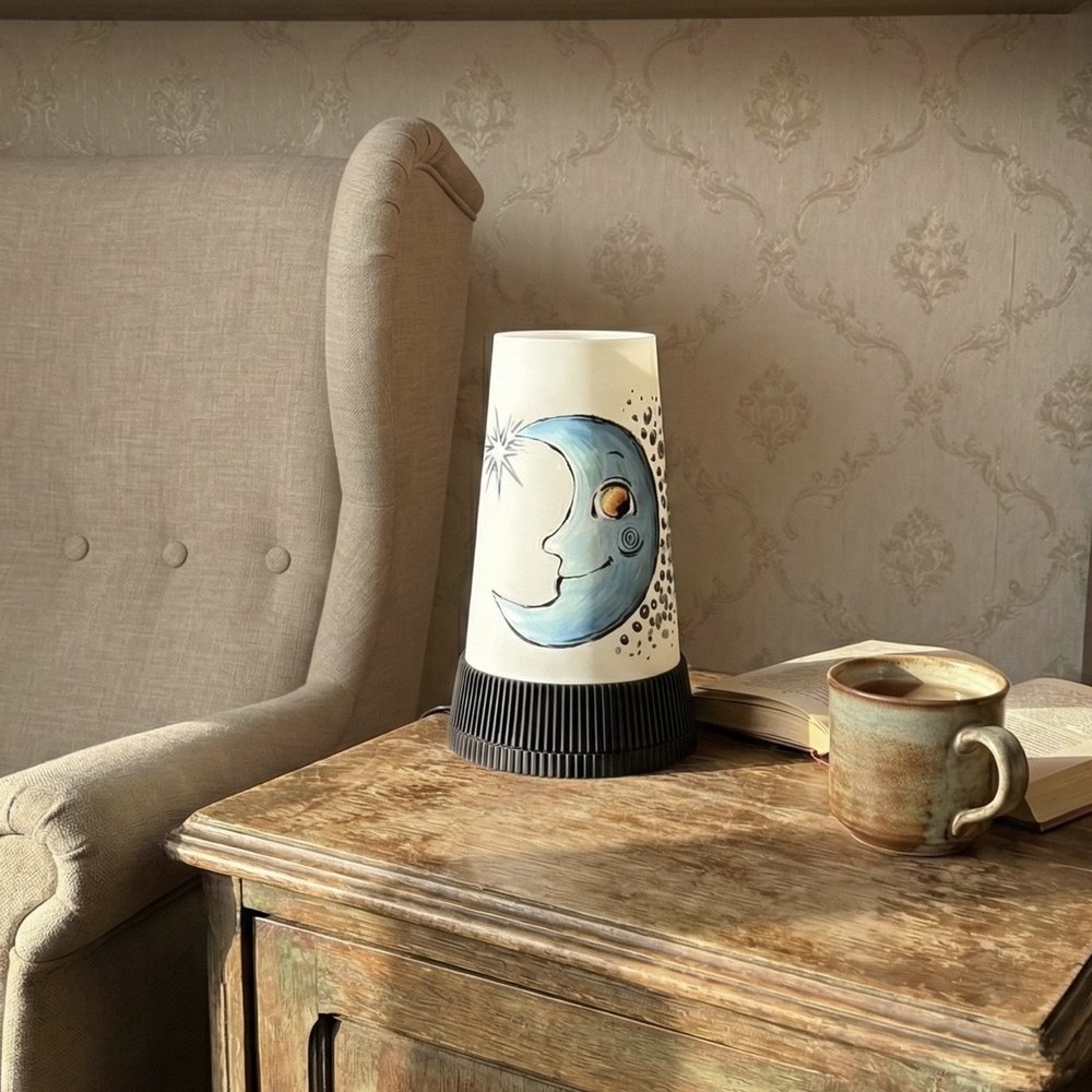 Ručně malovaná dekorativní lampa s motivem měsíce přináší do interiéru klid a harmonii. Teplé světlo jemně prosvítá difuzorem a vytváří příjemnou atmosféru pro večerní zklidnění, čtení nebo odpočinek.