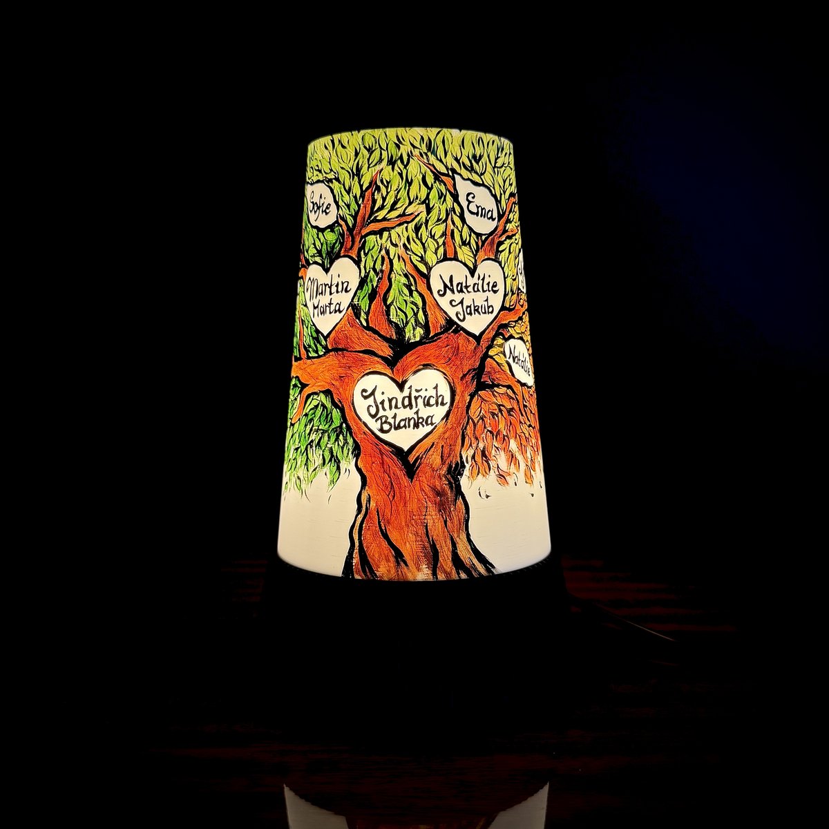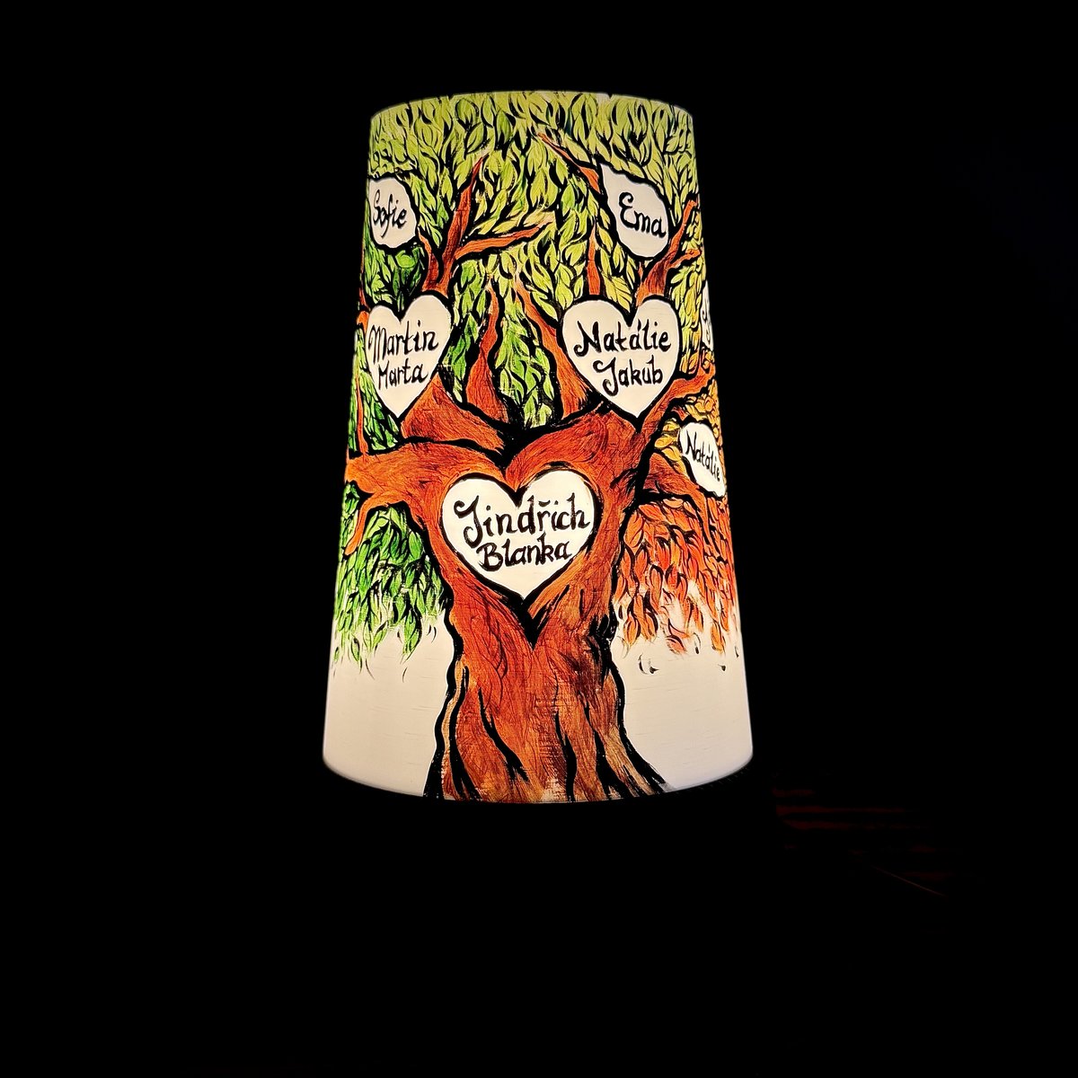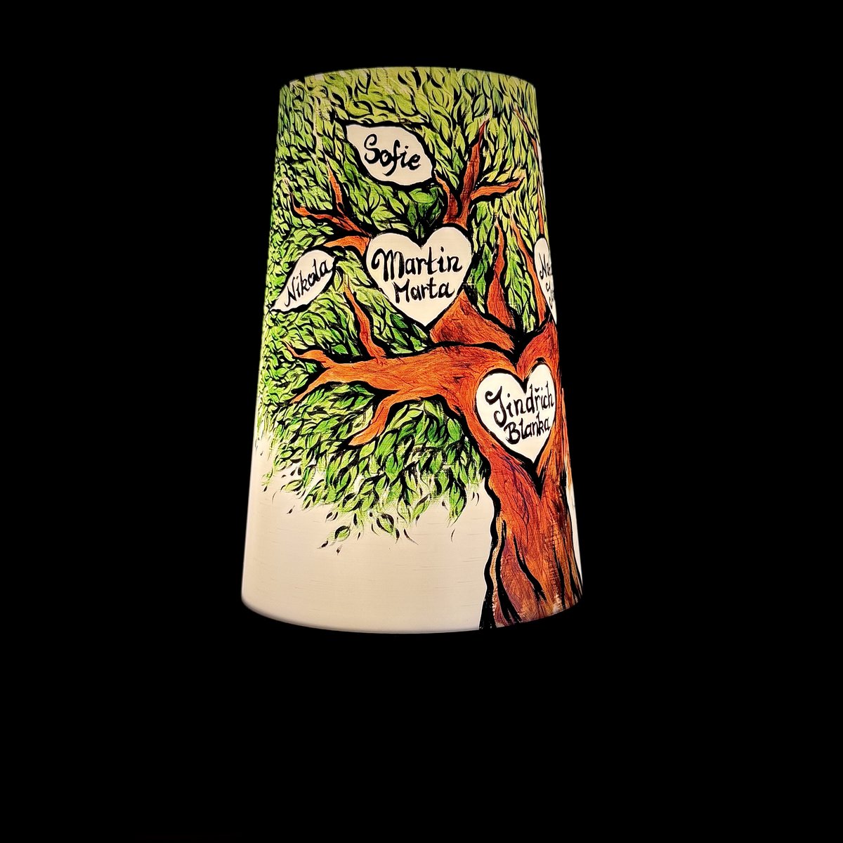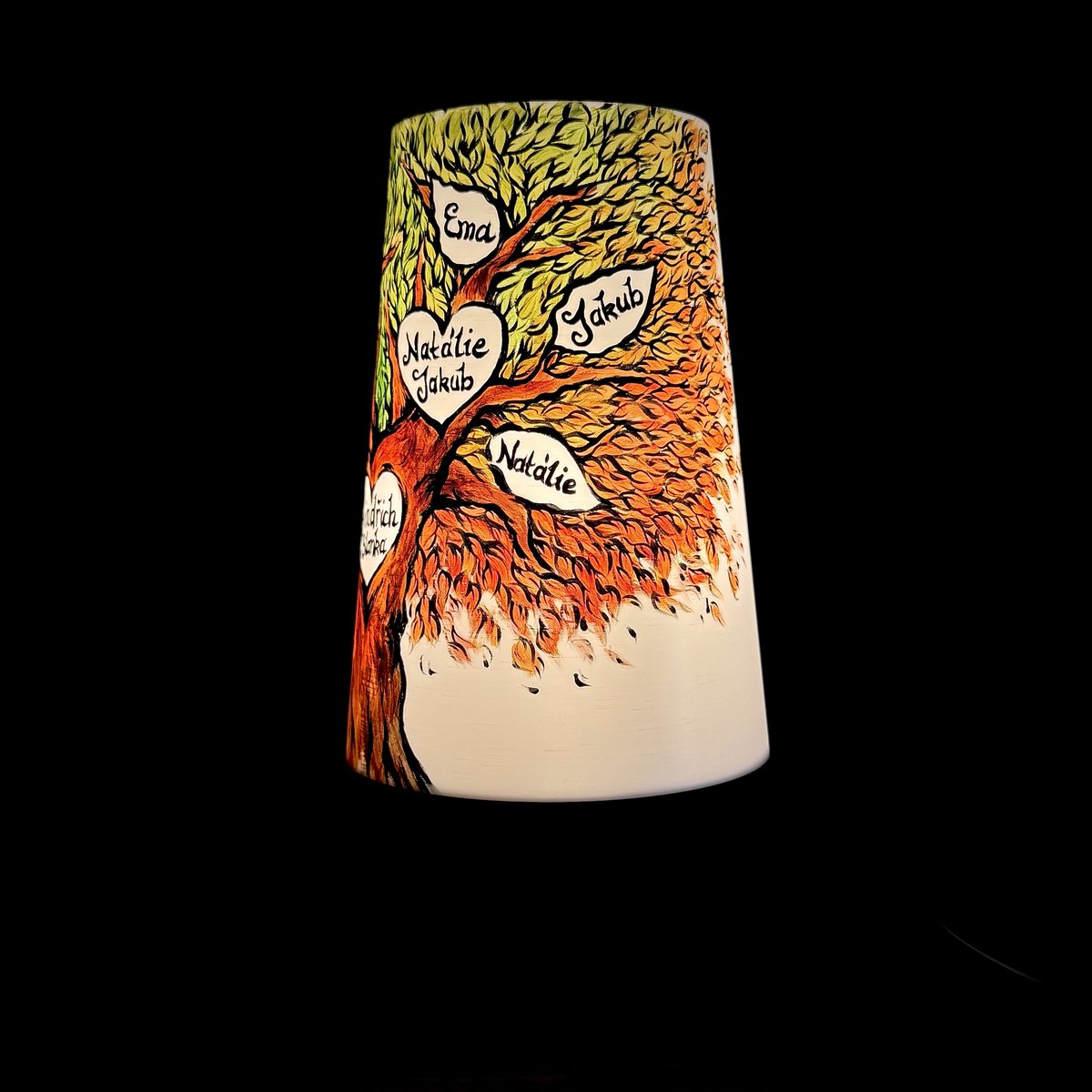 Tato ručně malovaná lampa vychází z původního motivu Strom života, ke kterému přidává osobní dotek – jména členů rodiny nebo rodokmen vetkaný do větví symbolizujících propojení a lásku.