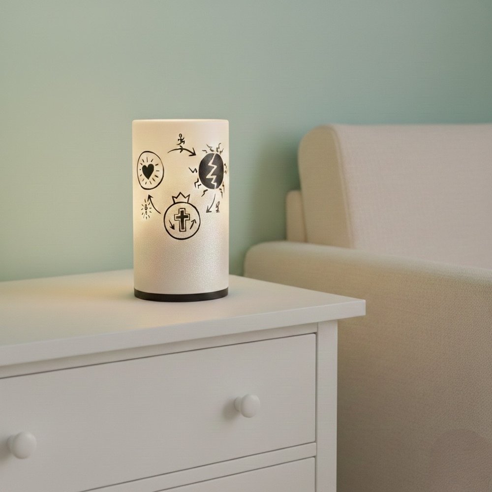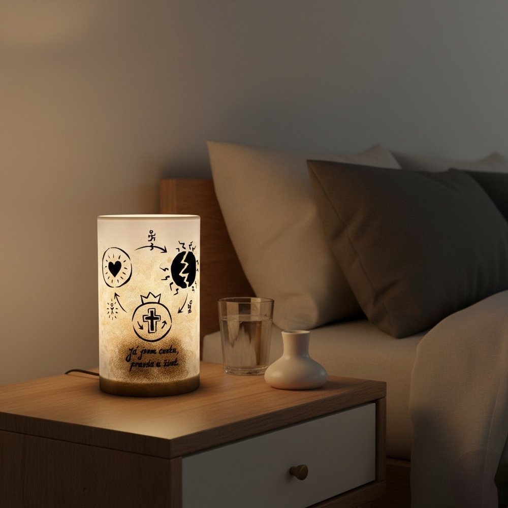 Citat na lampě je viditelný pouze po rozsvícení.