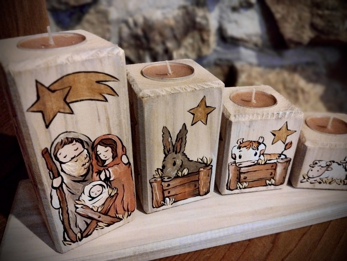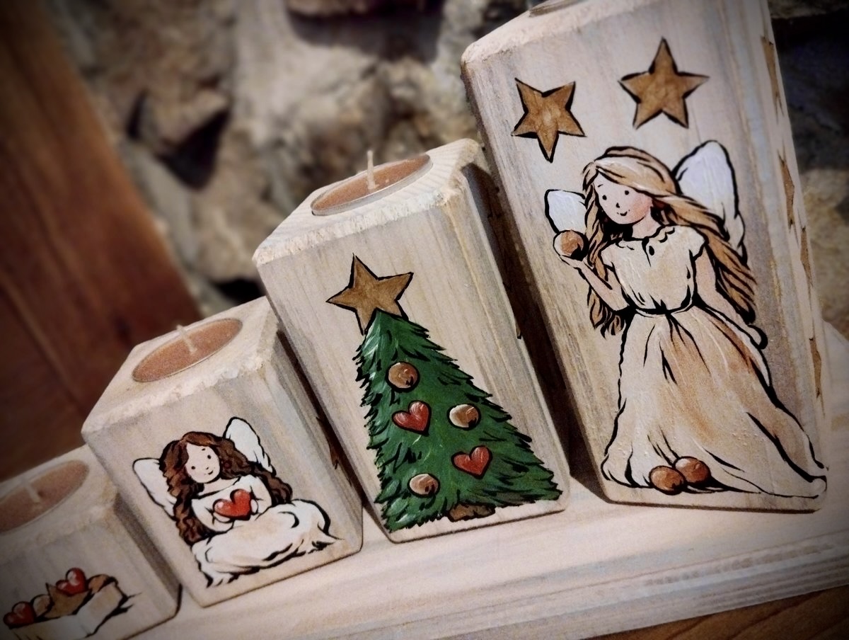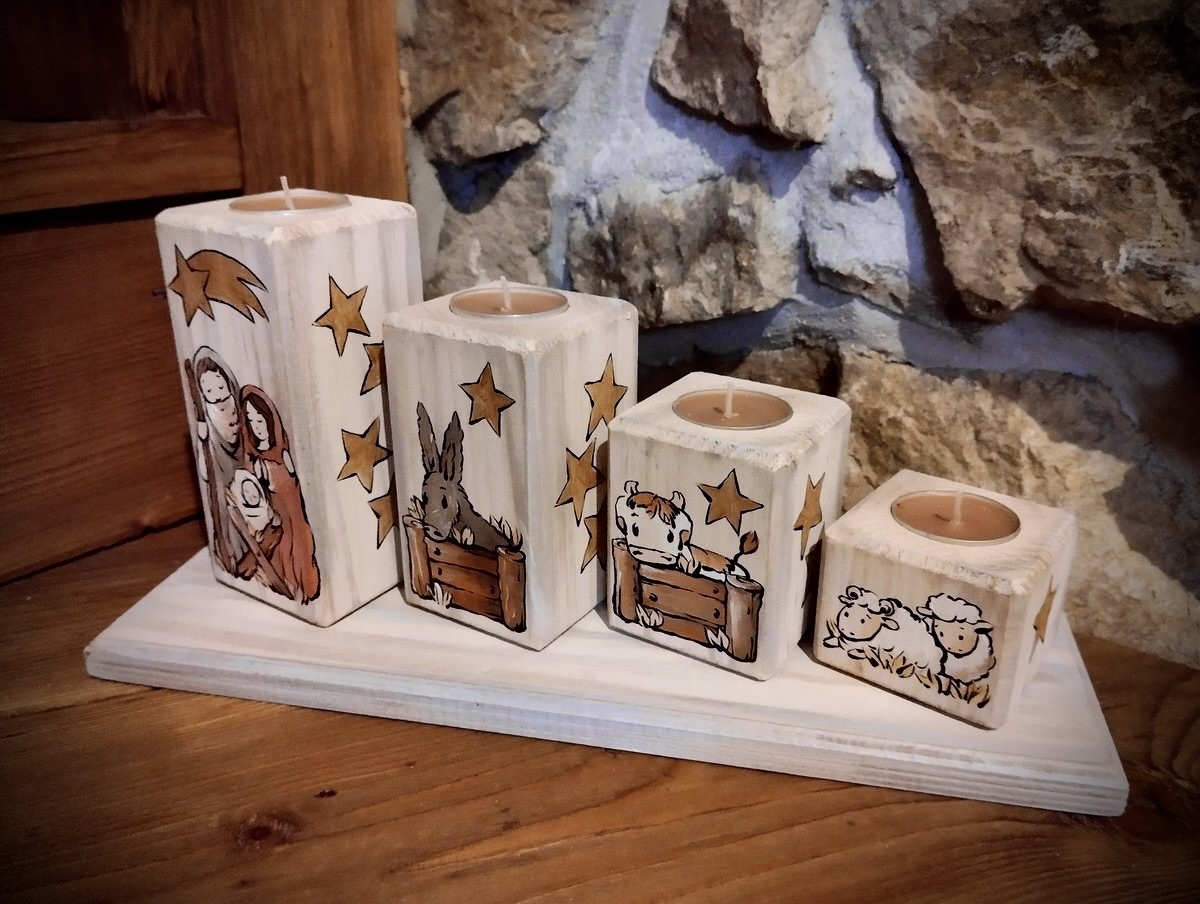Ručně malovaná vánoční sada svícnů s motivy Betléma vnese do vašeho domova kouzlo adventu. Originální dekorace na dřevěné podložce je ideální pro sváteční stůl i jako jedinečný dárek. Přední strana svícnů zobrazuje Betlém se zvířátky, zatímco zadní strana andělíčky zdobící vánoční stromeček.